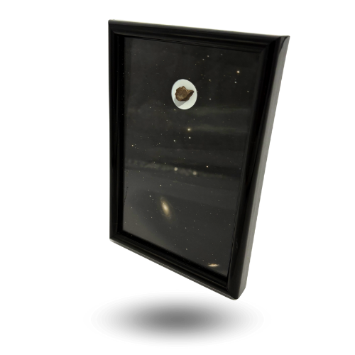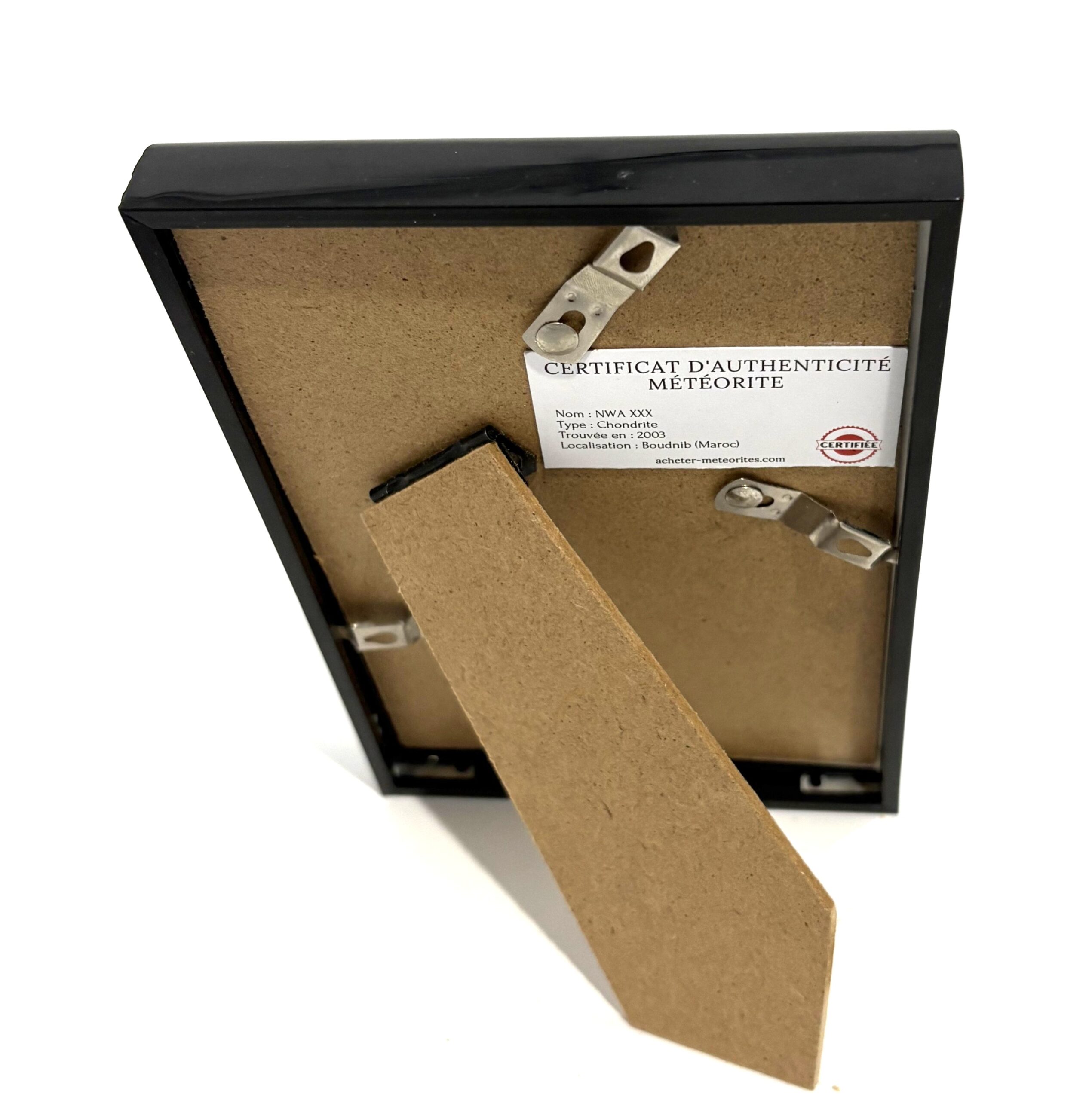 Le fragment NWA XXX présenté dans ce cadre possède une véritable origine spatiale. Il est mis en valeur de manière claire et équilibrée. Le certificat d’authenticité est placé à l’arrière du cadre. L’ensemble offre un objet rare, idéal pour les passionnés d’espace ou de décoration scientifique.